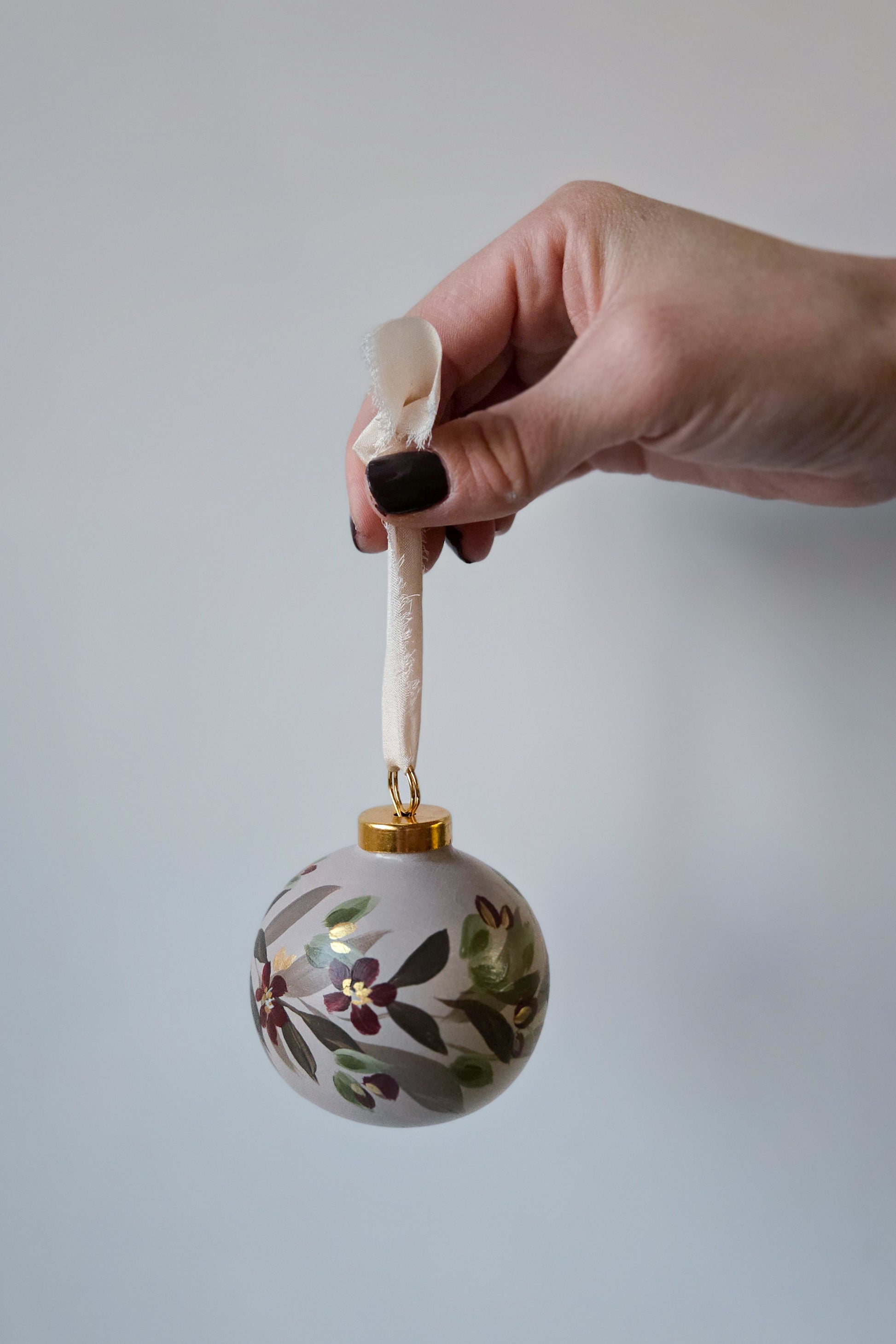 This beautifully crafted ceramic ornament has been carefully painted by hand to capture the natural beauty of florals with intricate details and gold accents. Varnished, this ornament will last a lifetime and is topped with the most luxurious ribbon.