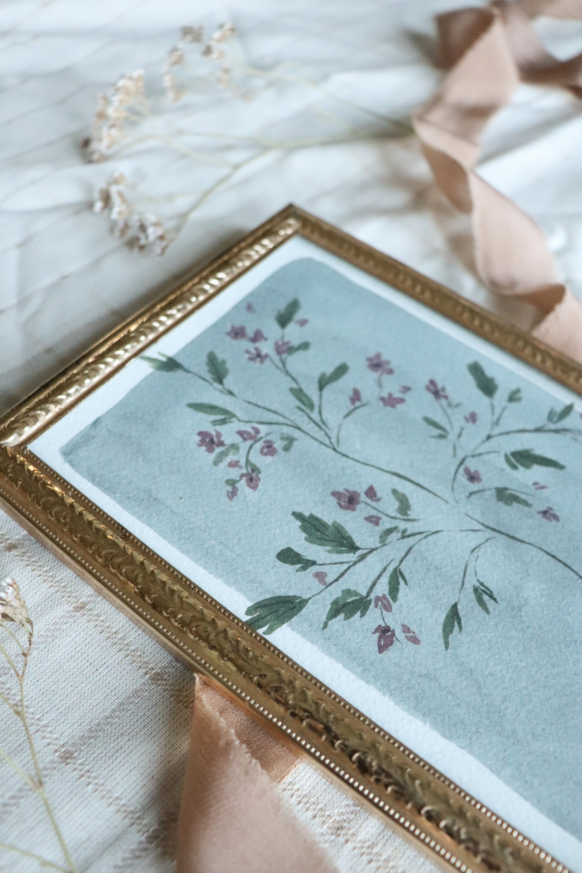 This original is 5x7 inches and comes signed on 100% archival cotton paper, and has the option to be framed in a vintage gold frame.