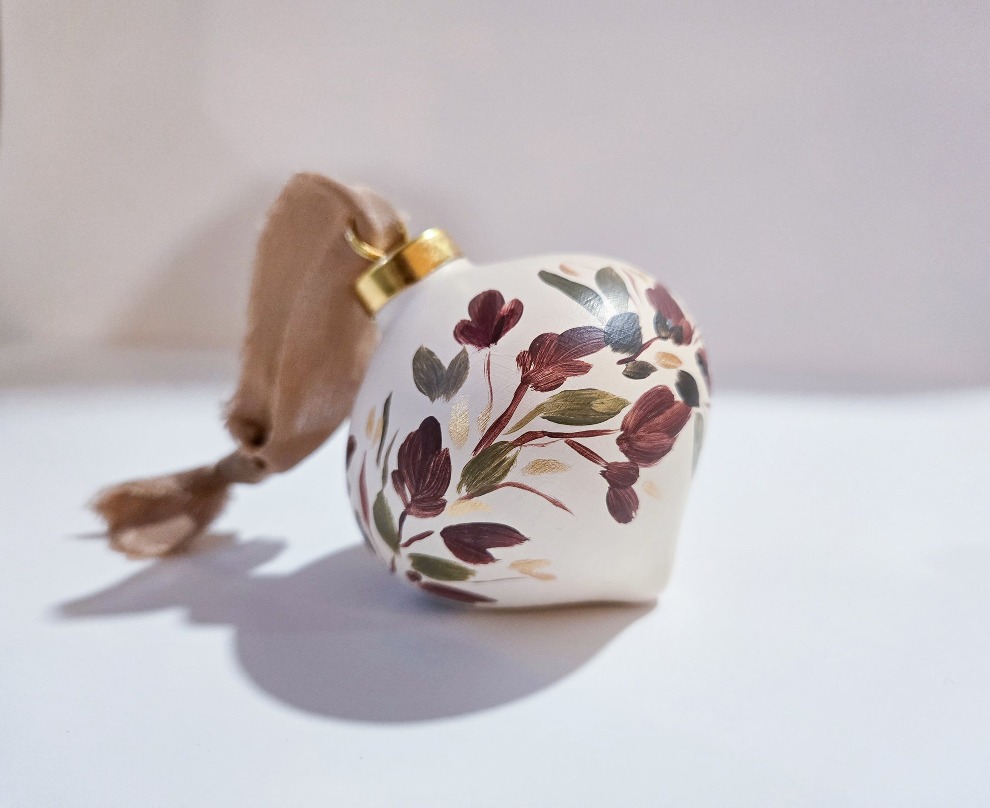 This beautifully crafted ceramic ornament has been carefully painted by hand to capture the natural beauty of florals with intricate details and gold accents. Varnished, this ornament will last a lifetime and is topped with the most luxurious ribbon.